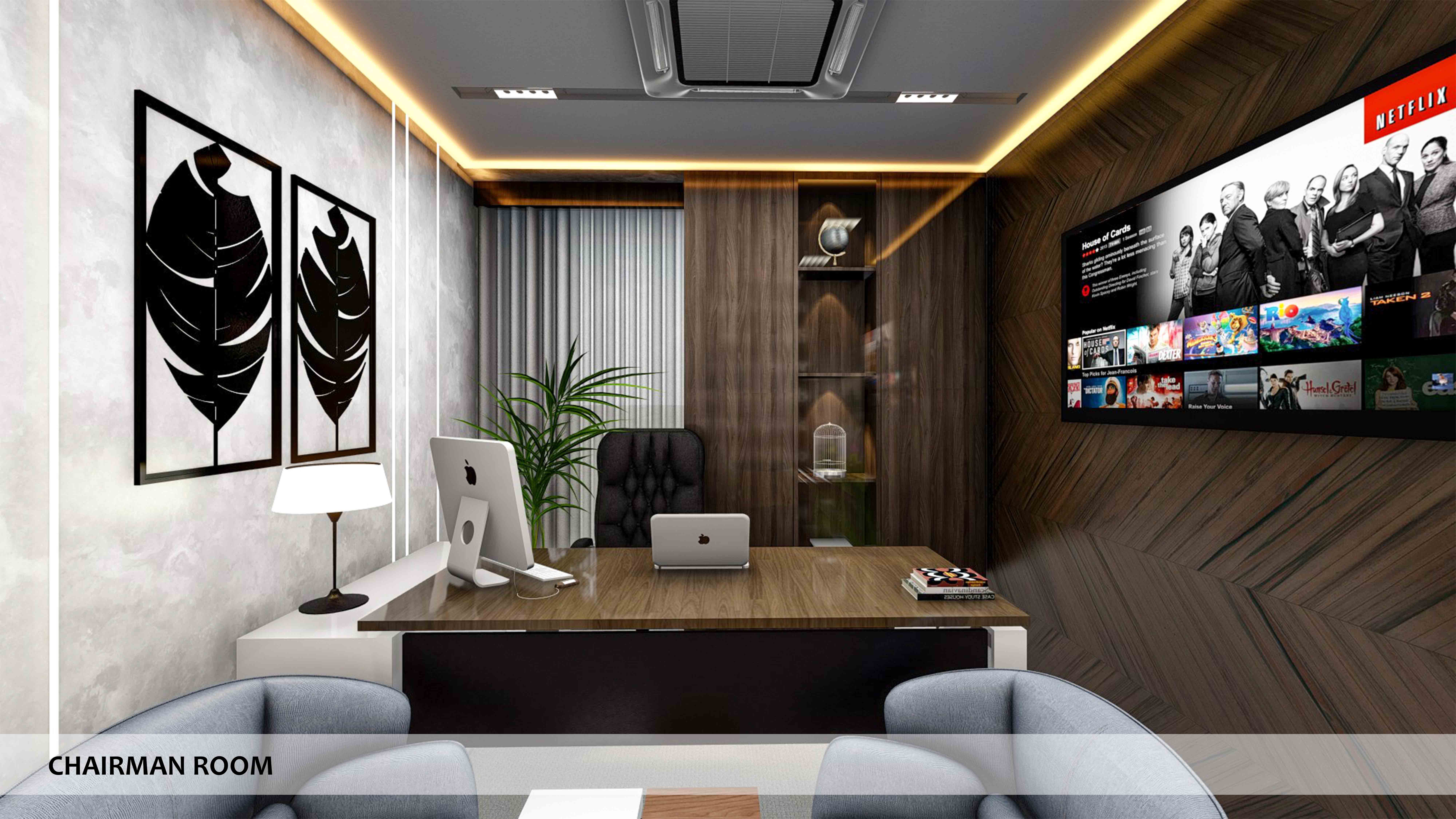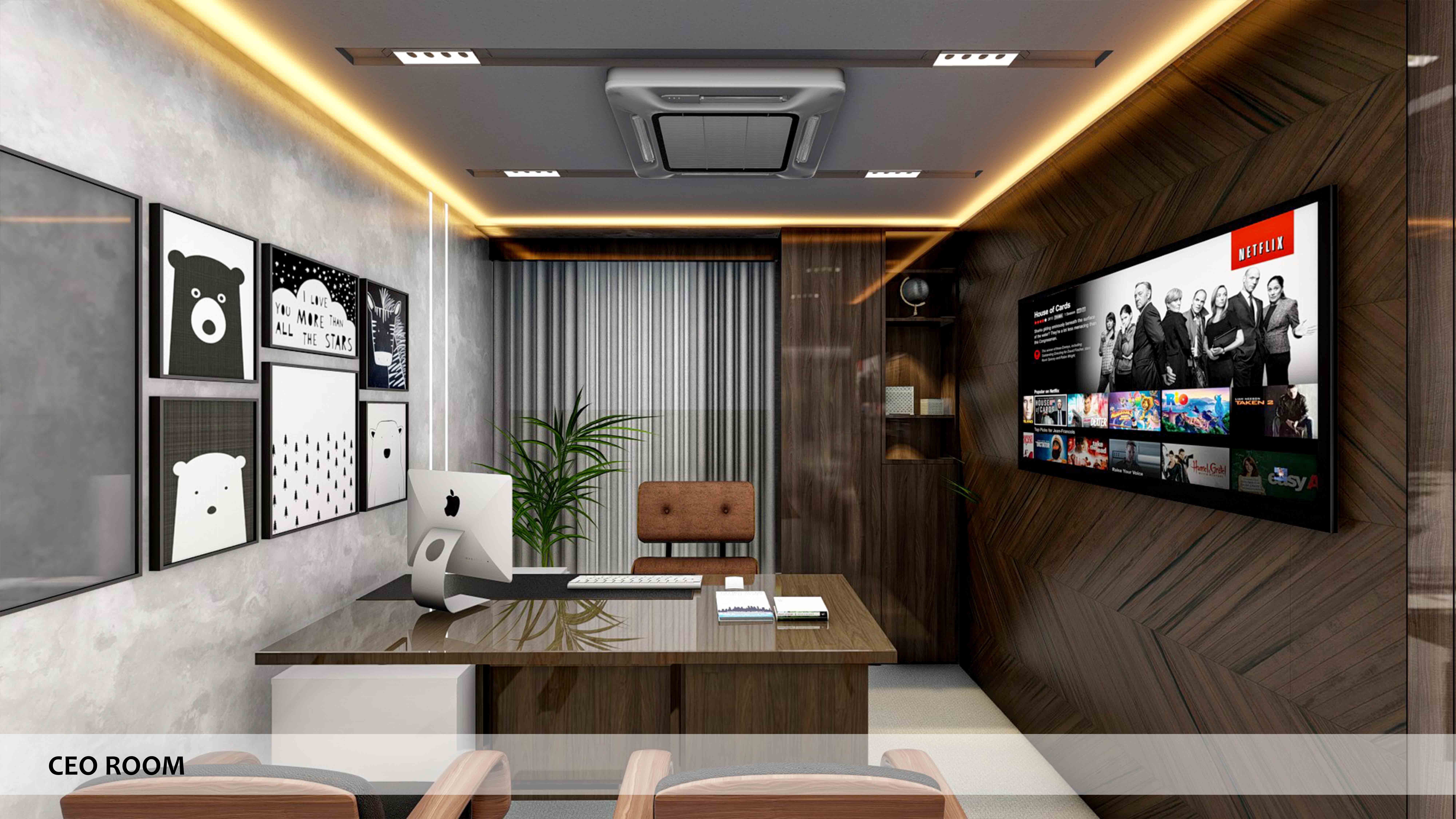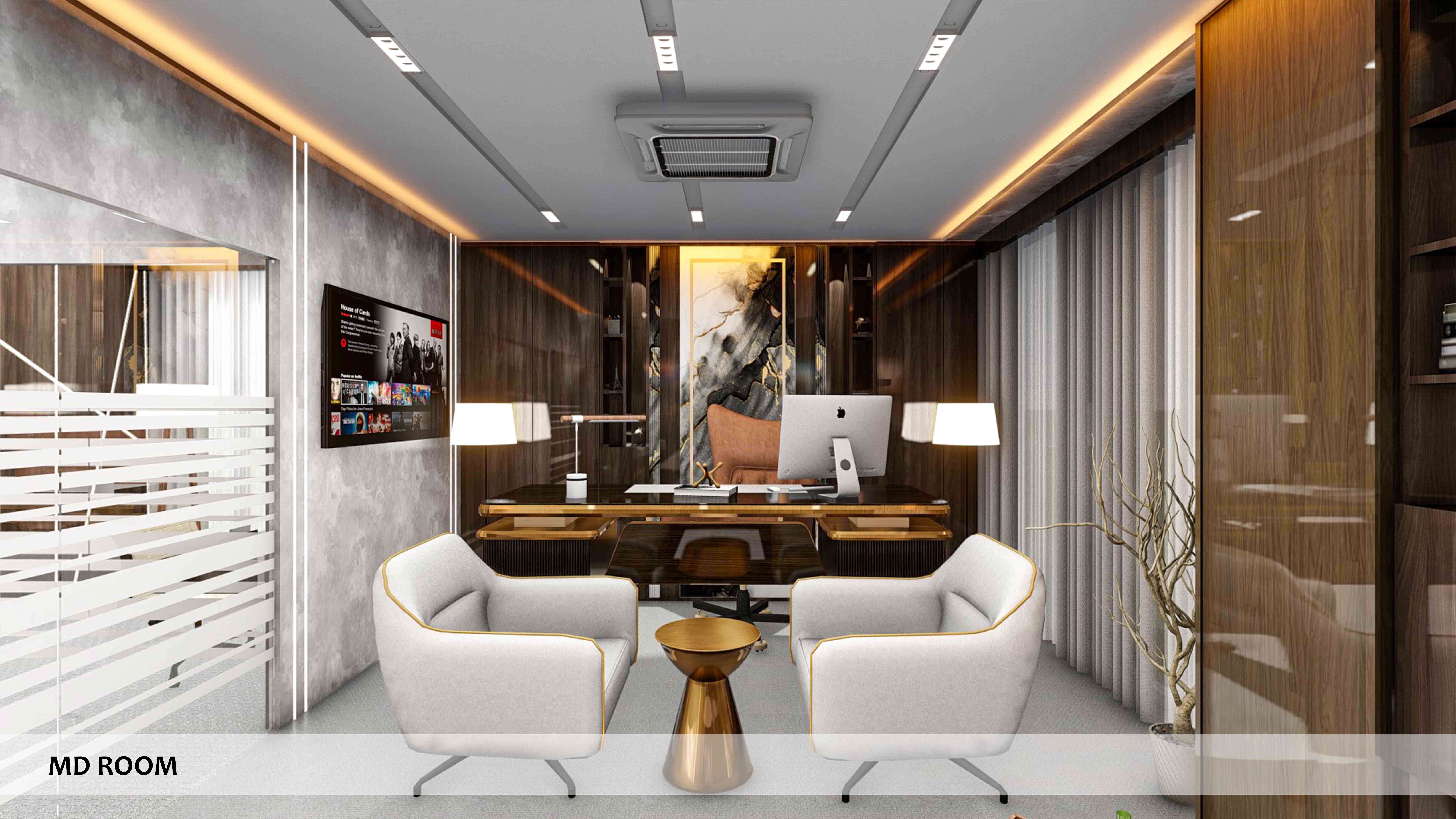 Every seniors rooms are designed as private executive zones that reflect authority and sophistication. A combination of wood veneer, soft grey walls, and strategic lighting establishes a calm and focused atmosphere. Custom furniture, minimal ornamentation, and framed monochrome artworks introduce a contemporary corporate character.