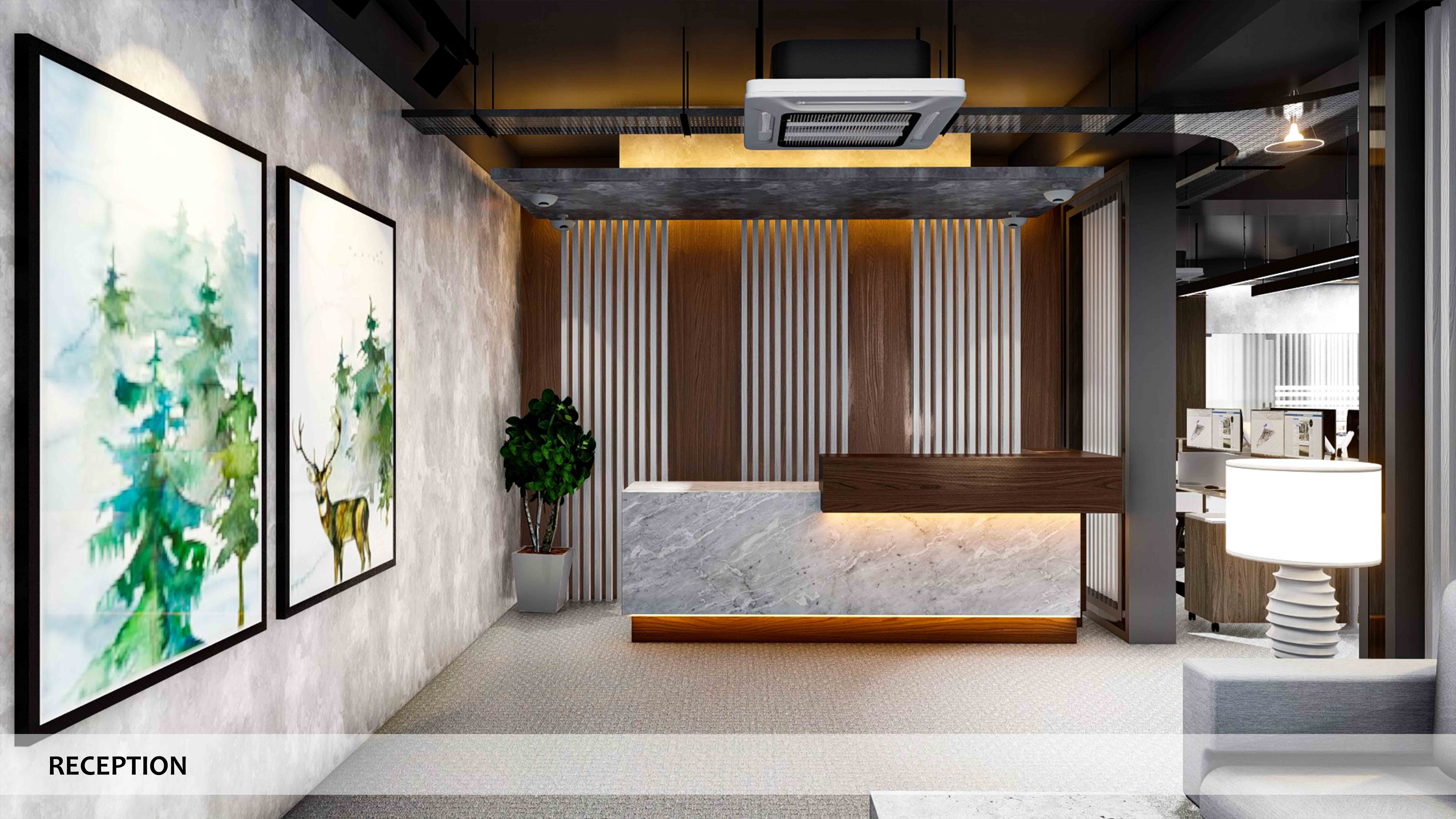 The reception area serves as the visual anchor of the office -blending marble, timber, and soft illumination to create a welcoming first impression. Large nature-inspired artworks and indoor plants enhance the biophilic connection, bringing balance to the otherwise structured environment.