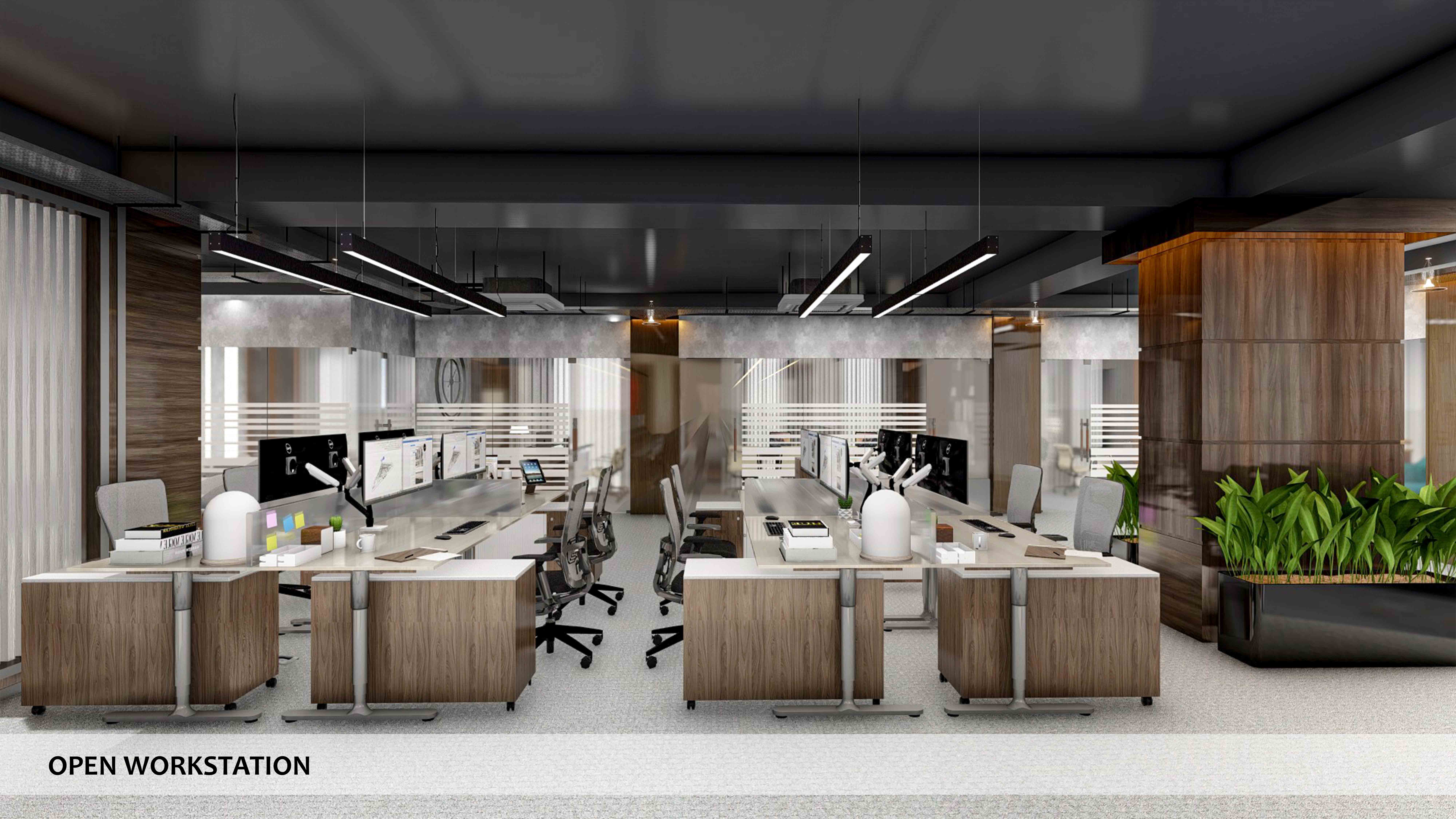 The open workstation fosters collaboration through a fluid spatial layout, ensuring visual connectivity and efficient communication among team members. Linear lighting and suspended ceiling elements accentuate the sense of depth while integrating acoustic and HVAC systems seamlessly.